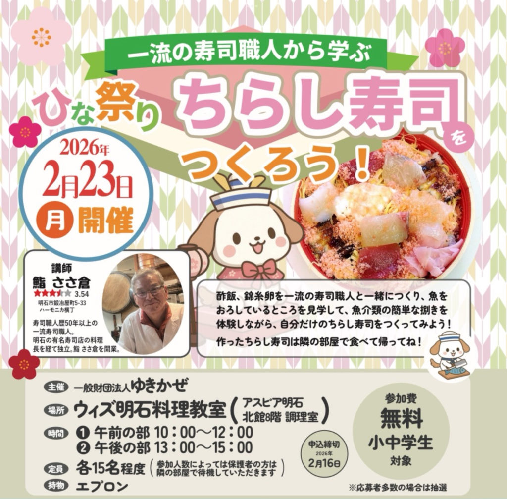 2026年2月23日(月祝日)、ウイズ明石料理教室にて小中学生を対象したひな祭りちらし寿司体験イベントを開催いたします。参加費無料。