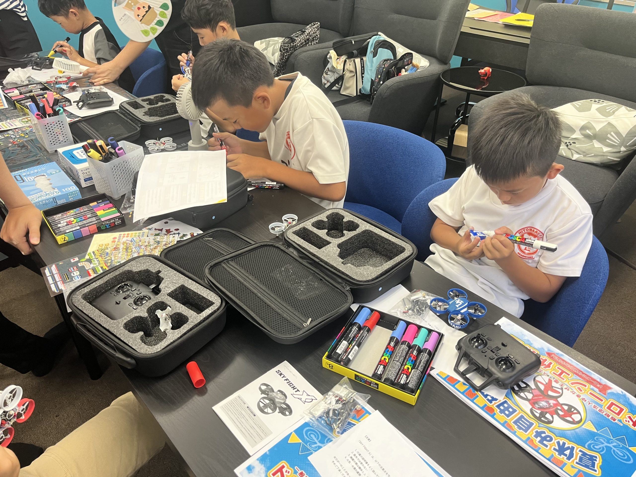 最初のペイントタイムでは、真っ白なミニドローンに、マーカーやシールを使って思い思いのデザインを施してもらいました。カラフルなドローンや、キャラクターを模したユニークなデザインなど、子どもたちの個性が光る時間となりました。
