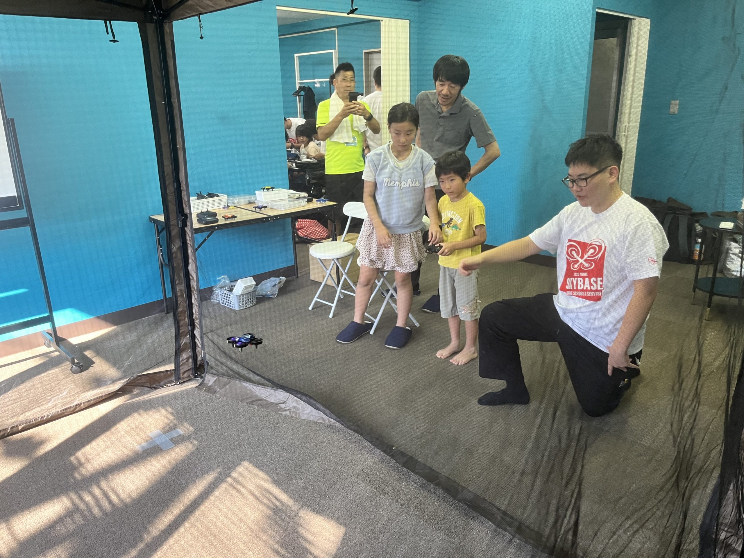 その後のフライト体験では、スタッフの指導のもと、安全に配慮しながら室内で飛行操作を楽しみました。初めてドローンに触れる子がほとんどでしたが、コツをつかむとどんどん上達し、自分で描いたドローンが宙を舞うたびに、笑顔と歓声があふれました。